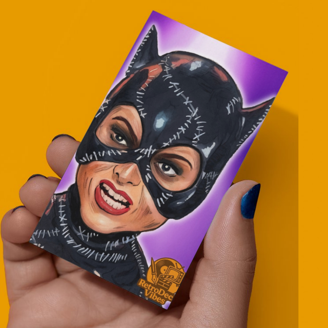 This collectible sketch card features a reproduction of my original Catwoman portrait, combined with custom graphics to create a unique printed sketch card in standard trading card size. Each card has been carefully designed to capture the feel of a collectible while showcasing my artwork in a new format.