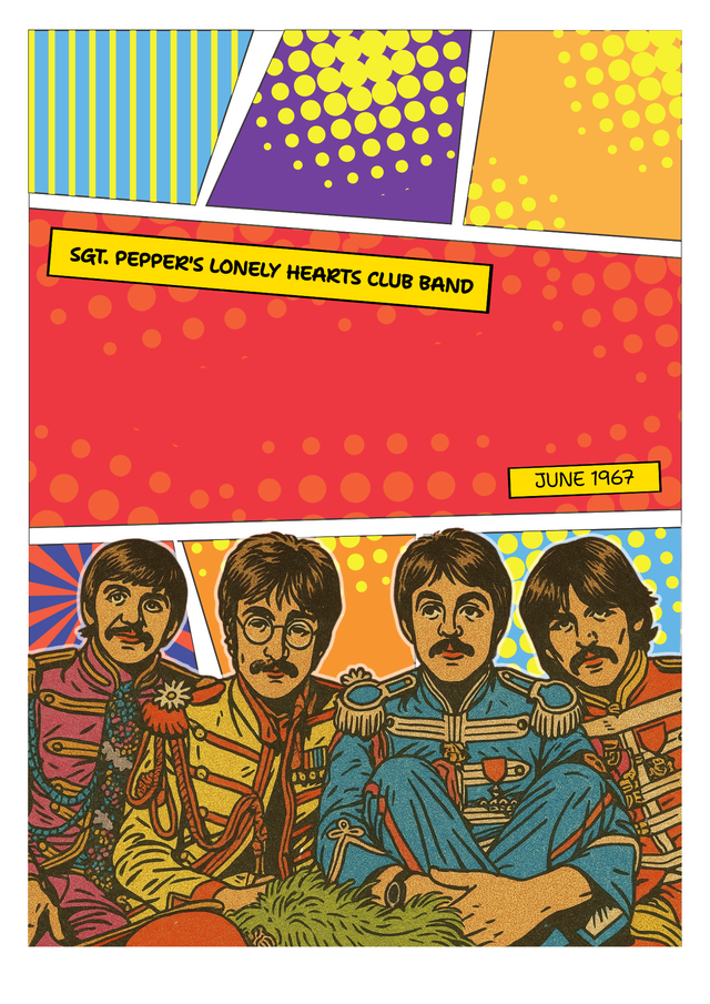 Step into the vibrant world of Sgt. Pepper's Lonely Hearts Club Band with this unique illustrated music poster! This carefully designed piece features a bold, comic book-style twist on one of the most iconic albums of all time.